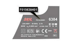 The Skil rating plates are found on the Clam shell of the machine usually near the motor. The labels show the typ number of the machine which is usually 10 digits long and start (F 015) you can also find on these plates details such as wattage, voltage and rpm.